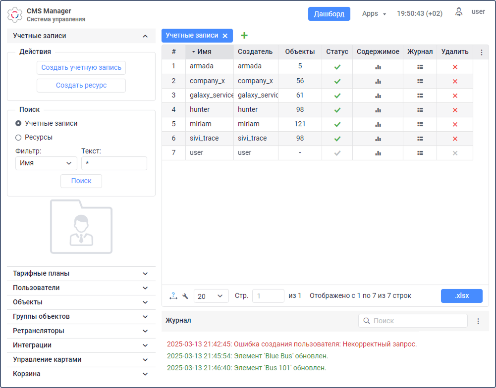 - создание объектов, геозон, маршрутов, водителей, прицепов и других элементов системы;