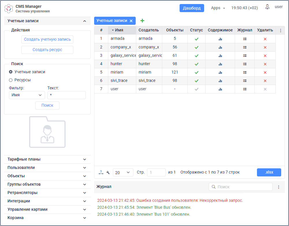 Система управления CMS Manager предназначена для пользователя верхнего уровня и пользователей с правами дилера и позволяет им настраивать структуру сервиса, управлять учетными записями, ресурсами, пользователями, объектами и другими макроэлементами системы.