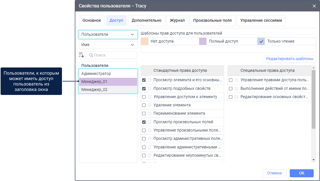 | Управление доступом к элементу | Позволяет видеть пользователя в свойствах других пользователей на вкладке Доступ, где на него можно установить права доступа.При передаче прав учитывайте правила иерархии. |