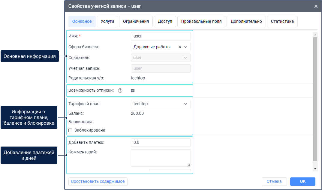 В этой секции вкладки Основное содержится следующая информация об учетной записи: