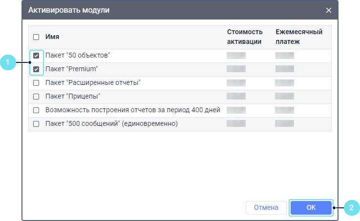 Пользователь верхнего уровня может самостоятельно подключать дополнительные модули, такие как 50 объектов, Расширенные отчеты, 500 сообщений и др. Для их подключения откройте окно Активировать модули, выбрав одноименный пункт в меню пользователя.