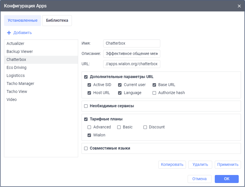 Добавлять приложения может только пользователь верхнего уровня. Для этого в меню пользователя предусмотрен специальный пункт — Конфигурация Apps. Выбрав данный пункт меню, вы откроете диалоговое окно, которое содержит две вкладки — Установленные и Библиотека. Эти вкладки дают возможность ознакомиться со всеми доступными приложениями, а также сконфигурировать и добавить новые.