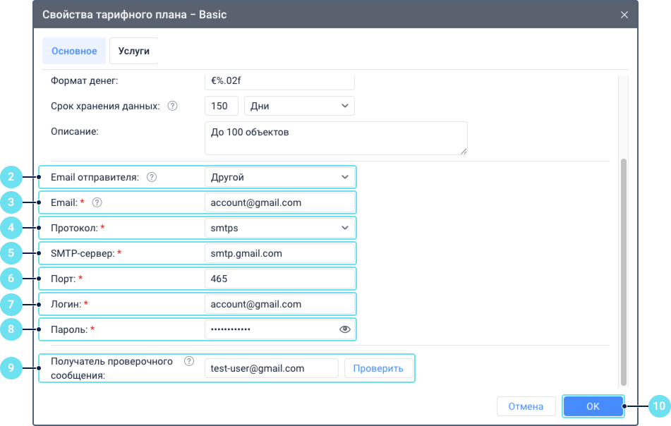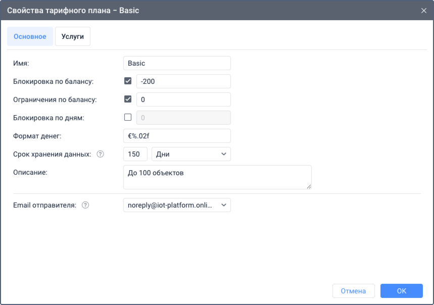 На вкладке Основное можно указать общие настройки тарифного плана, связанные с блокировкой учетных записей, хранением данных и пр. Некоторые из них можно указать вручную отдельно для учетной записи. Также здесь настраиваются параметры электронной почты для отправки различных системных сообщений (уведомлений, отчетов и т. п.).