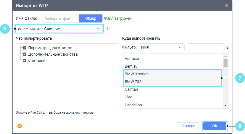Выберите тип импорта: замена, слияние или добавление. О типах импорта и импорте в элементы системы см. подробнее здесь.