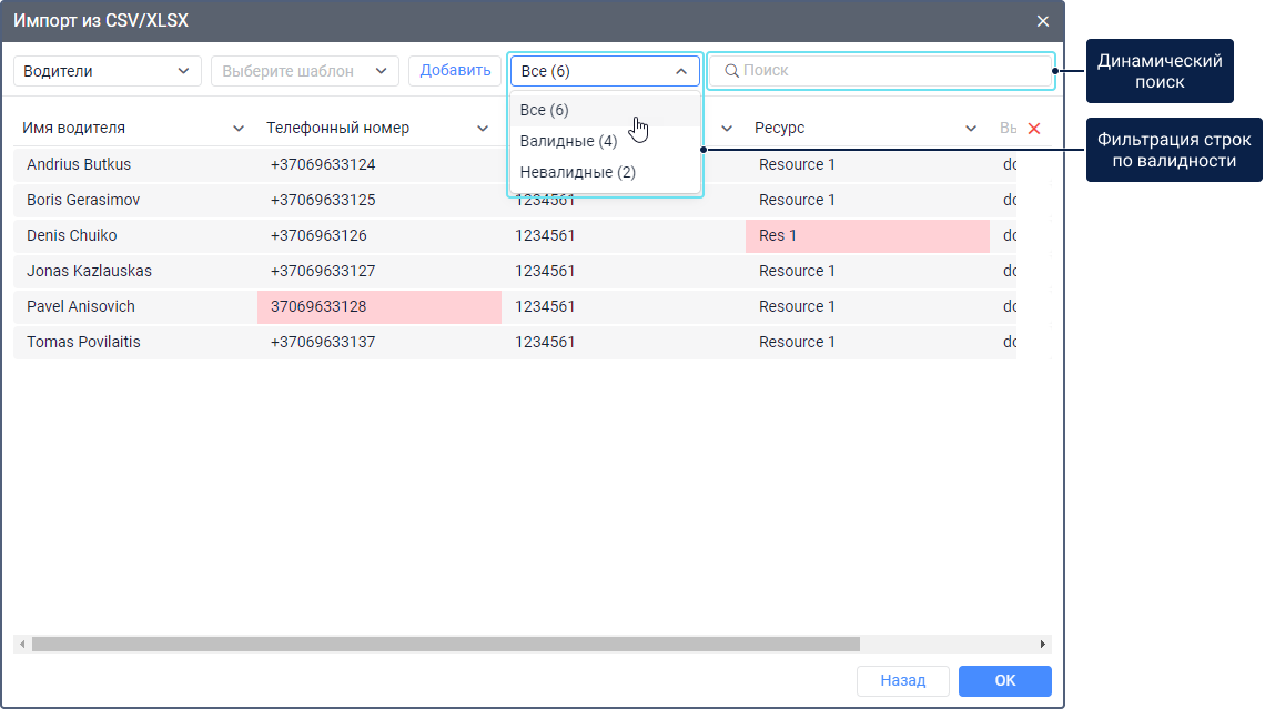 Слева от поиска расположен фильтр, который позволяет выбрать, какие строки вы хотите увидеть в таблице: все, валидные или невалидные. По умолчанию показываются все строки. В скобках справа от пункта Все показывается общее количество строк в таблице.