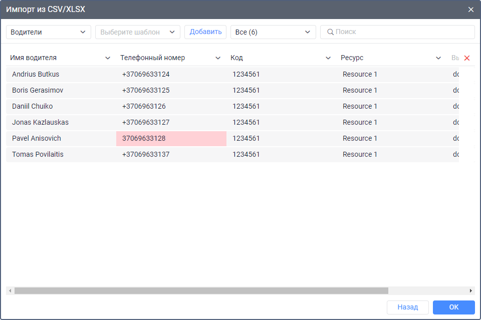 Ресурс* | Ресурс, в который вы хотите импортировать водителя. | Имя ресурса должно совпадать с именем существующего в системе ресурса. Также для учетной записи, которой принадлежит этот ресурс, должна быть активирована услуга Водители. |
