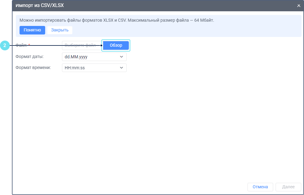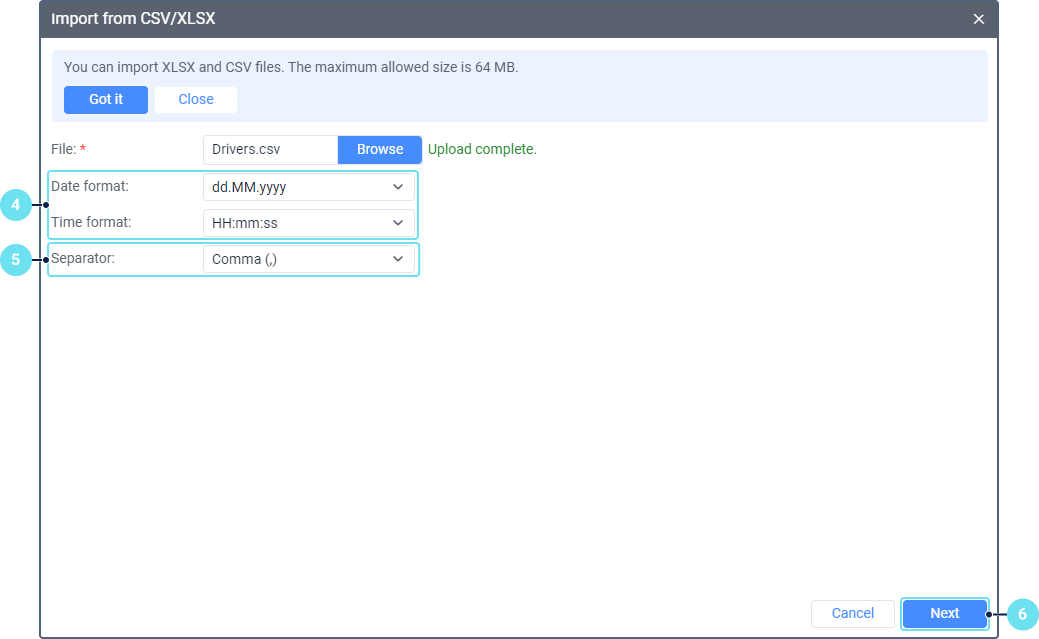 Функция Импорт из CSV/XLSX позволяет массово импортировать в систему объекты, заправки и водителей из файлов в форматах CSV и XLSX.