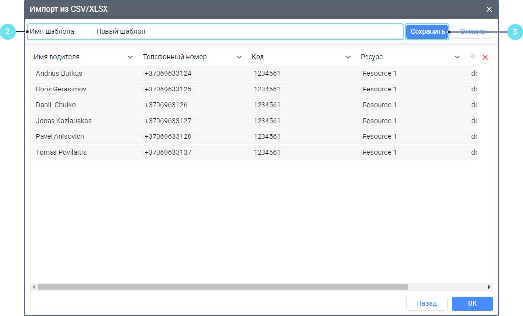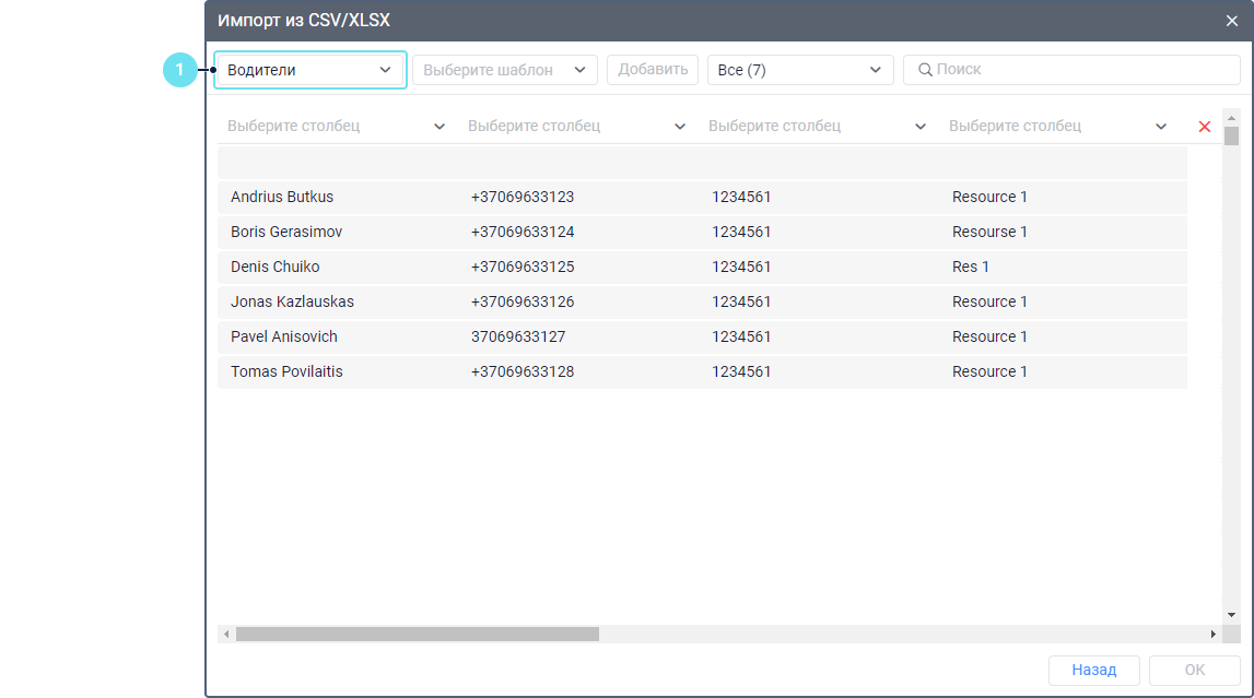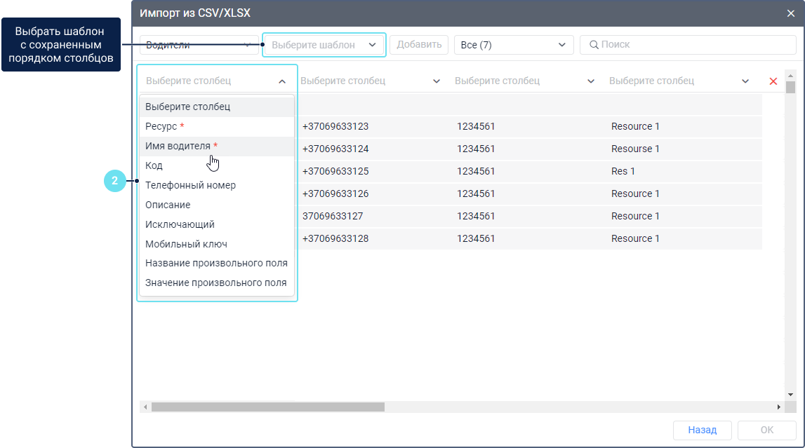 Укажите названия столбцов. Для этого вы можете применить сохраненный ранее шаблон или выбрать названия в выпадающих списках над столбцами. Названия, которые обязательно нужно выбрать, отмечены звездочкой (*). Описание всех доступных столбцов смотрите в разделах Таблица импорта объектов, Таблица импорта водителей, Таблица импорта заправок.