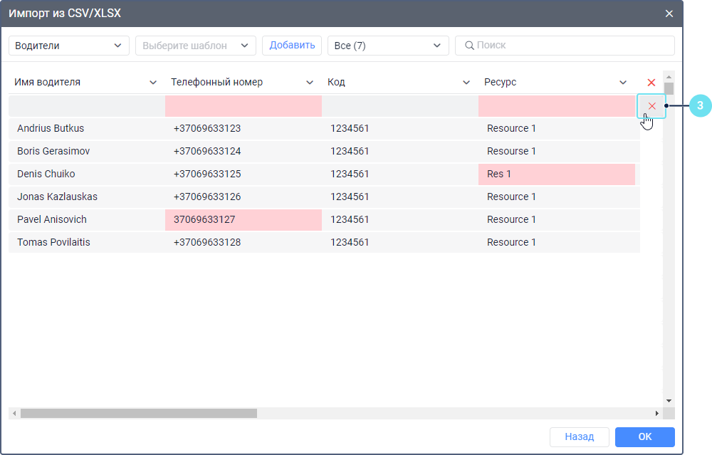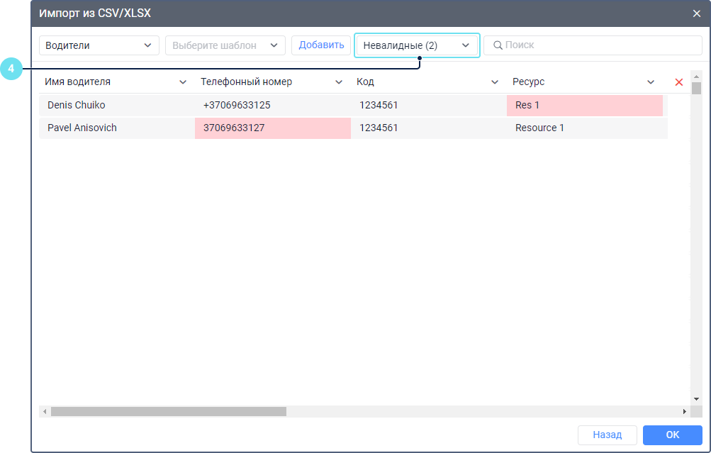 Ячейки с невалидными данными выделяются в таблице красным цветом. Импорт элементов с такими ячейками невозможен.
