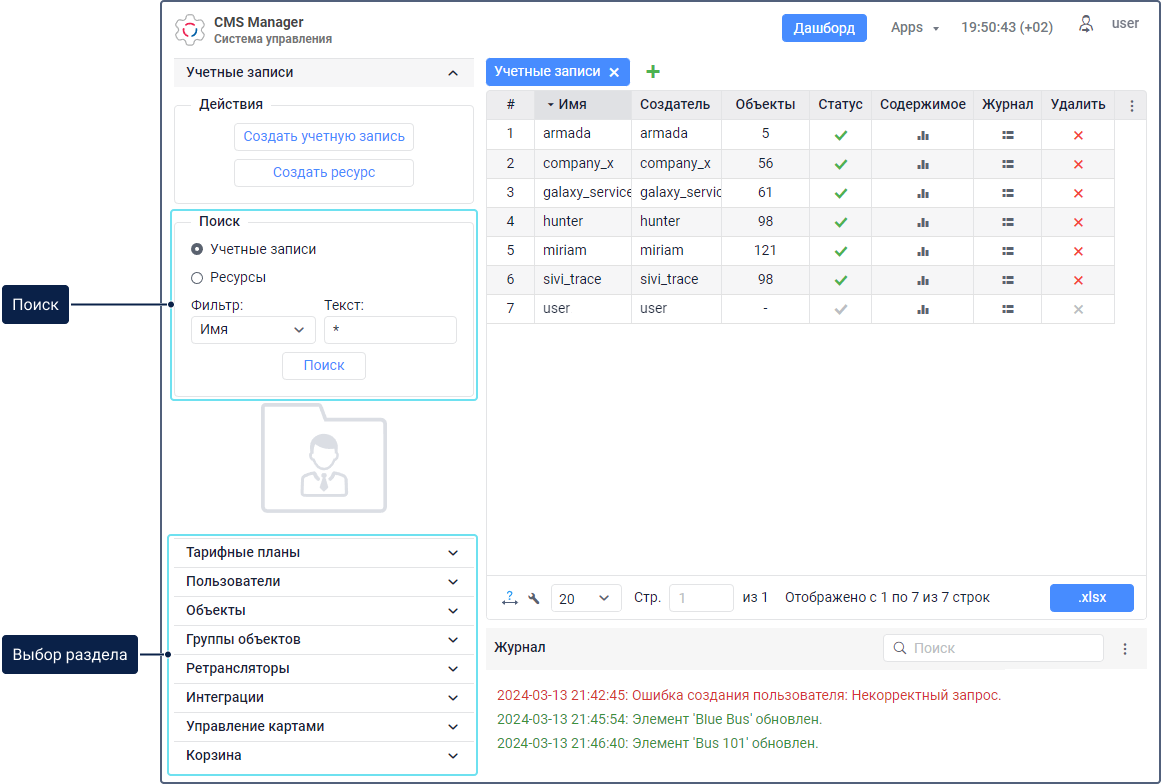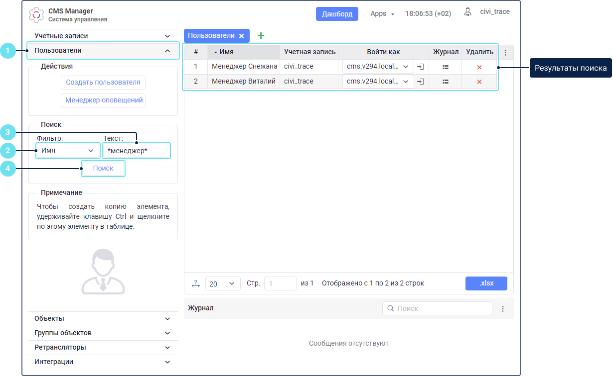 | Действия | В этой секции находится кнопка(и) для создания элементов системы (учетных записей, пользователей, объектов и т. д.). Для раздела Пользователи здесь также доступна кнопка Менеджер оповещений. |