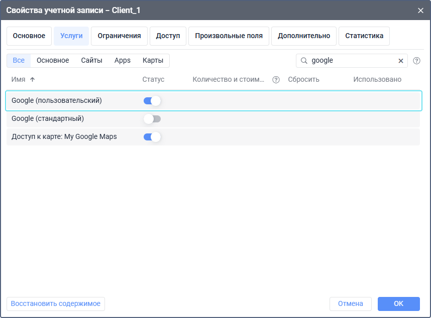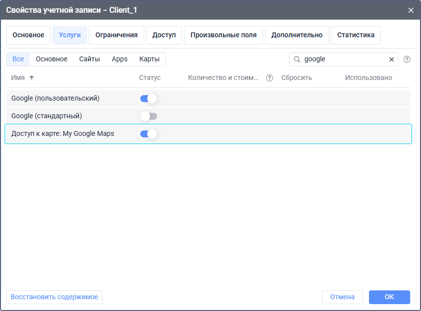 Для карт Google дополнительно включите услугу Google пользовательский или Google стандартный.