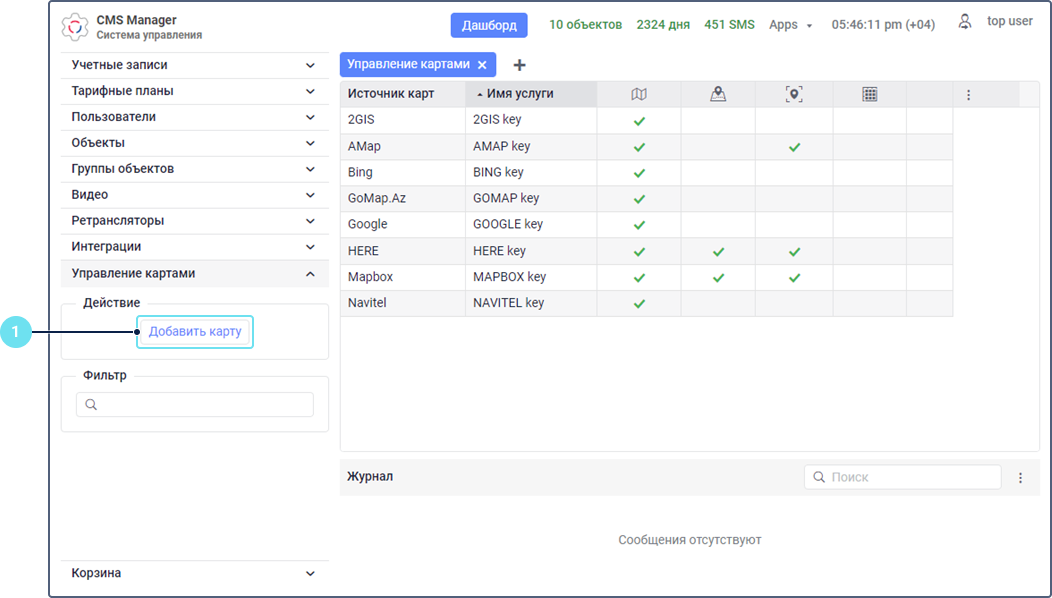 Раздел Управление картами доступен только в системе управления CMS Manager и для учетных записей верхнего уровня. В этом разделе можно добавлять, редактировать и удалять карты. В стандартной таблице представлены все добавленные карты, которые можно использовать в качестве картосновы, источника маршрутизации, источника геоданных и матрицы расстояний. В строке каждой карты отмечены ее доступные сервисы с помощью иконки