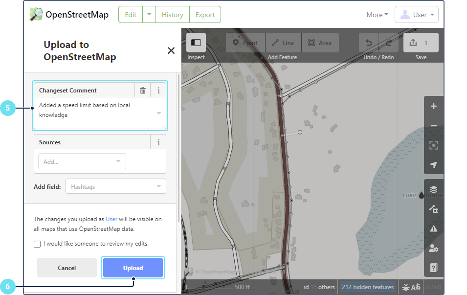 5. Напишите комментарий к своей правке, чтобы другие пользователи OpenStreetMap могли понять, какие изменения были внесены. Внимательно проверьте свои изменения.