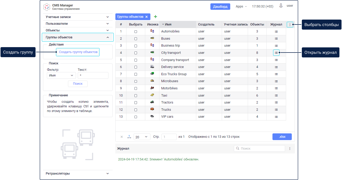 В таблице раздела Группы объектов содержатся все созданные группы. Также здесь можно выполнять следующие действия с ними: создание, копирование, редактирование свойств и удаление. Для быстрого поиска можно воспользоваться динамическим фильтром.