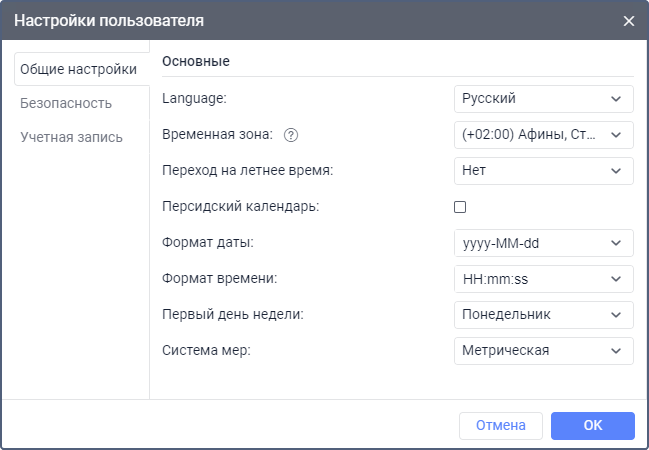 Общие настройкиНа этой вкладке можно выбрать язык интерфейса, часовой пояс, формат даты и времени и др.
