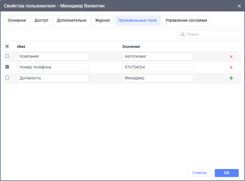 Чтобы создать произвольное поле, заполните поля Имя и Значение и нажмите на иконку . Поле Значение является необязательным. После сохранения изменений на вкладке все произвольные поля показываются в алфавитном порядке.