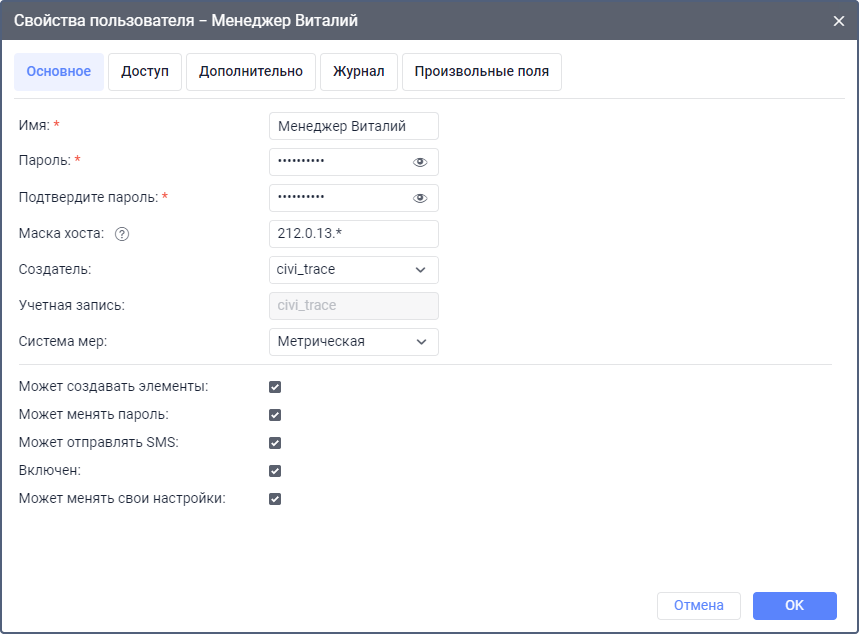 | Маска хоста | Маска IP-адреса устройства, с которого пользователь может входить в систему (макс. количество символов — 1024). Например, маска может понадобиться в случае, когда вход в систему должен быть доступен только с рабочего компьютера пользователя. При указании маски можно использовать звездочку (*), которая заменяет любое количество неизвестных символов. Пример маски: 212.0.13.*. Можно указать необходимое количество масок через запятую без пробелов. Если это поле не заполнено, пользователь может входить в систему с любых IP-адресов. |