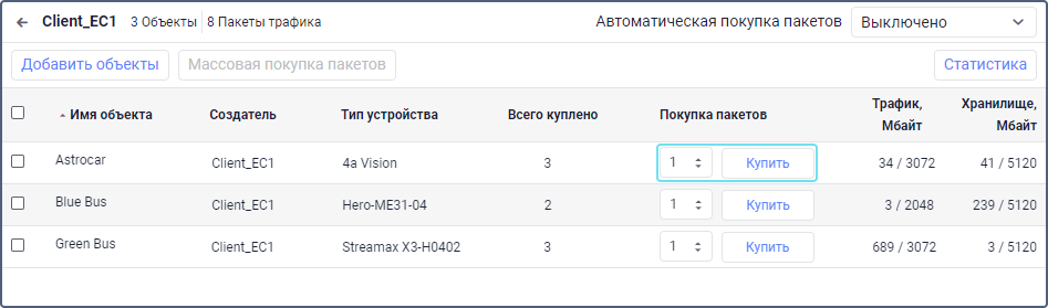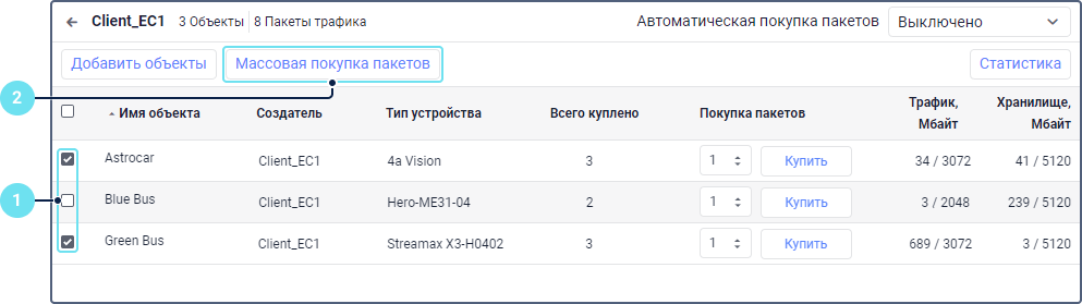 Отметьте объекты, для которых необходимо купить пакеты трафика. Чтобы отметить все объекты, поставьте галочку рядом с заголовком Имя объекта.