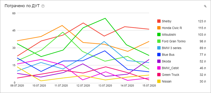 В графике этого блока содержится информация о том, сколько топлива было потрачено объектами по датчику уровня топлива за указанный интервал (семь дней по умолчанию). Если интервал больше 14 дней, данные на графике группируются. Если он равен одному дню, вместо линий показываются точки.