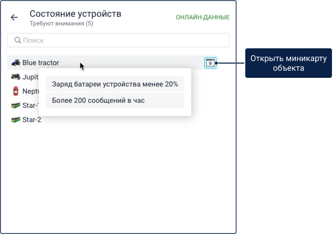 Чтобы увидеть перечень всех объектов, находящихся в геозоне, нажмите на ее имя. Над перечнем расположен динамический фильтр для поиска объектов по имени. Нажмите на строку с объектом, чтобы открыть его мини-окно.