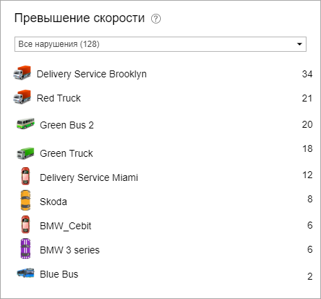 В этом блоке показывается перечень объектов, для которых были зарегистрированы нарушения по превышению скорости за указанный интервал (семь дней по умолчанию). Напротив имени объекта по умолчанию показывается количество всех его нарушений. Их можно отфильтровать, выбрав в выпадающем списке в верхней части блока необходимый диапазон значений. Например, можно увидеть количество нарушений объектов, где превышение скорости составило от 10 км/ч до 20 км/ч.