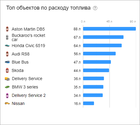 В блоке показываются объекты с максимальным расходом топлива по ДУТ за указанный интервал (семь дней по умолчанию). Напротив имени объекта указывается объем потраченного им топлива, который дополнительно представлен в горизонтальной диаграмме справа.