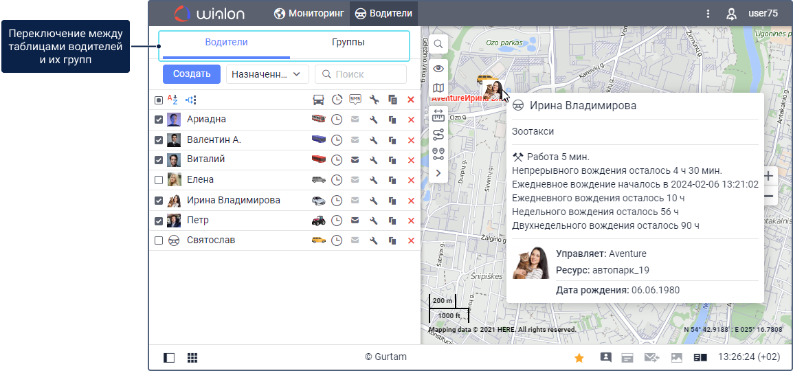Для работы с водителями щелкните по вкладке Водители в верхней панели или выберите одноименный пункт в окне настройки главного меню. Для работы с группами водителей перейдите в режим Группы.