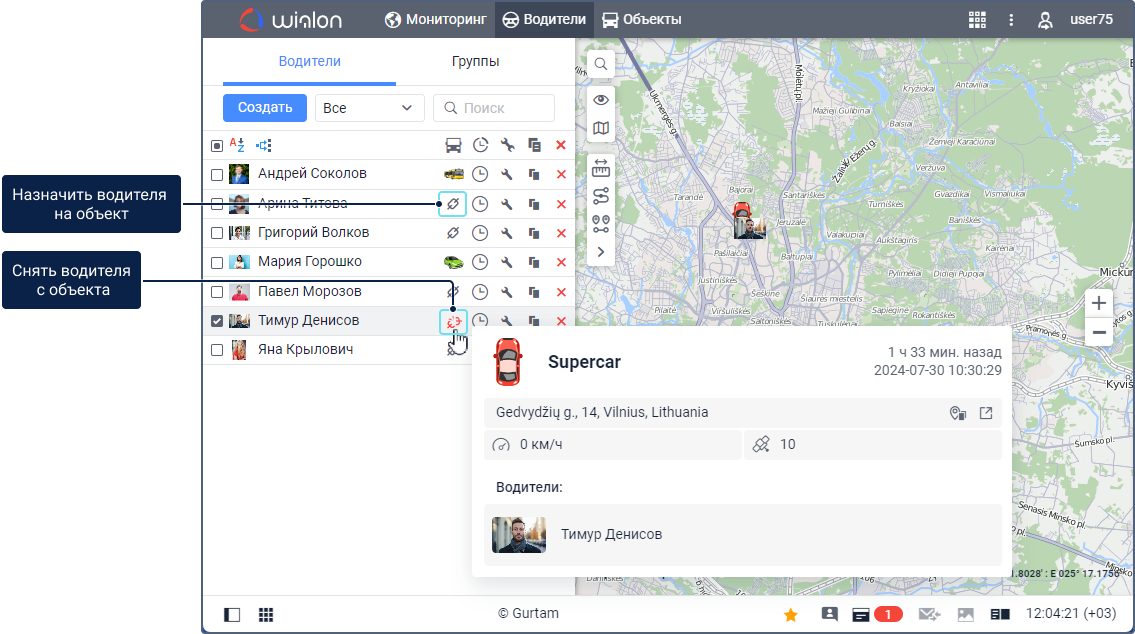 Назначить и снять водителя с объекта можно вручную или автоматически. После этого можно работать с историей назначений.