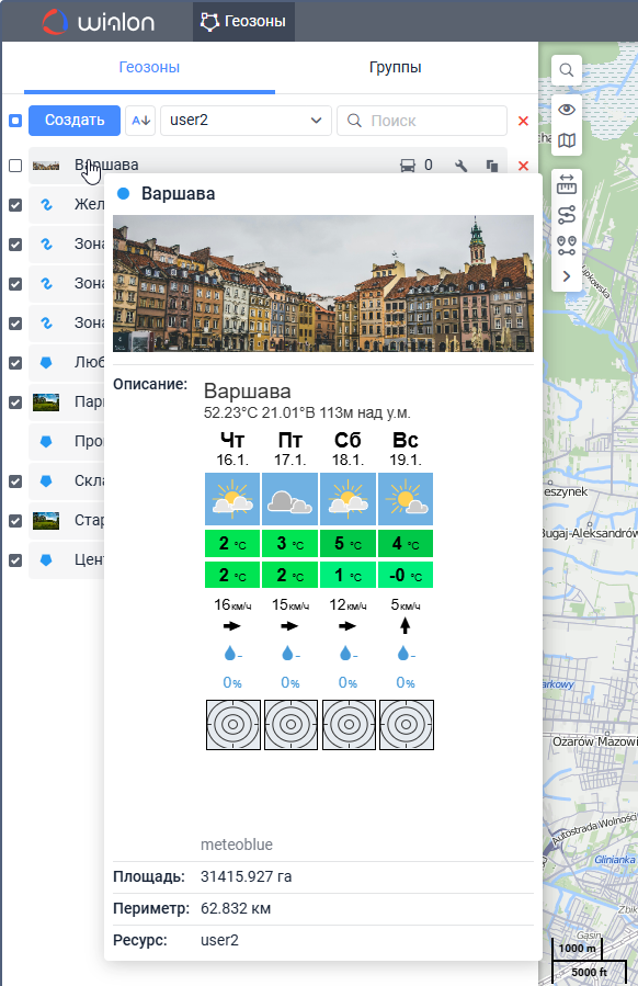 - выполнении действий из списка геозон: редактирование, копирование, удаление;