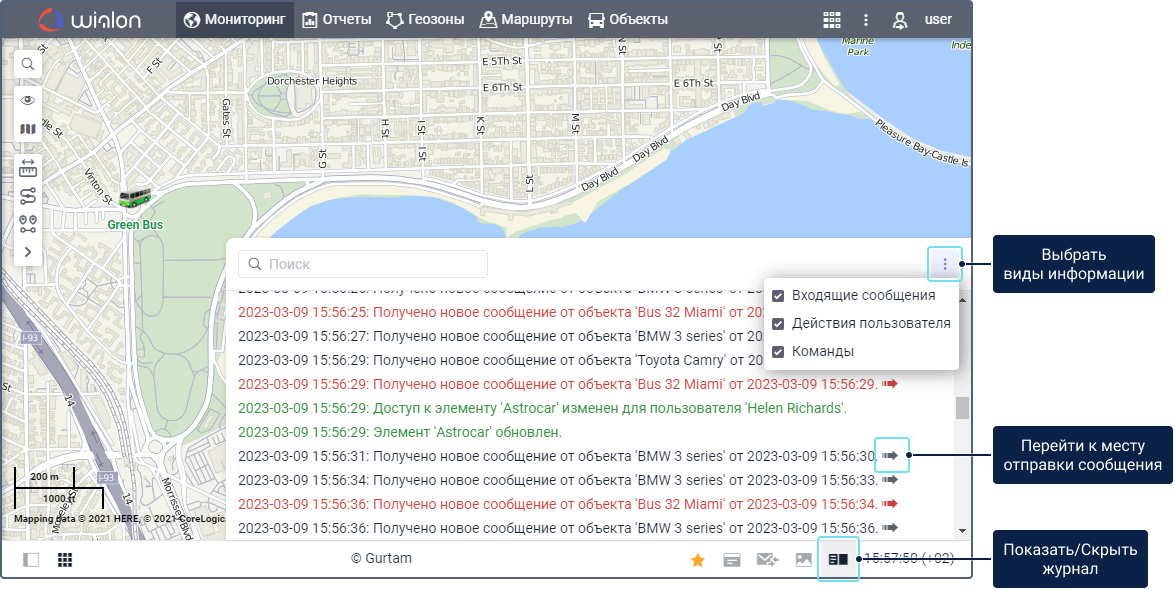 В журнале в реальном времени показывается информация о получении сообщений от объектов, отправке и выполнении команд и действиях пользователя.