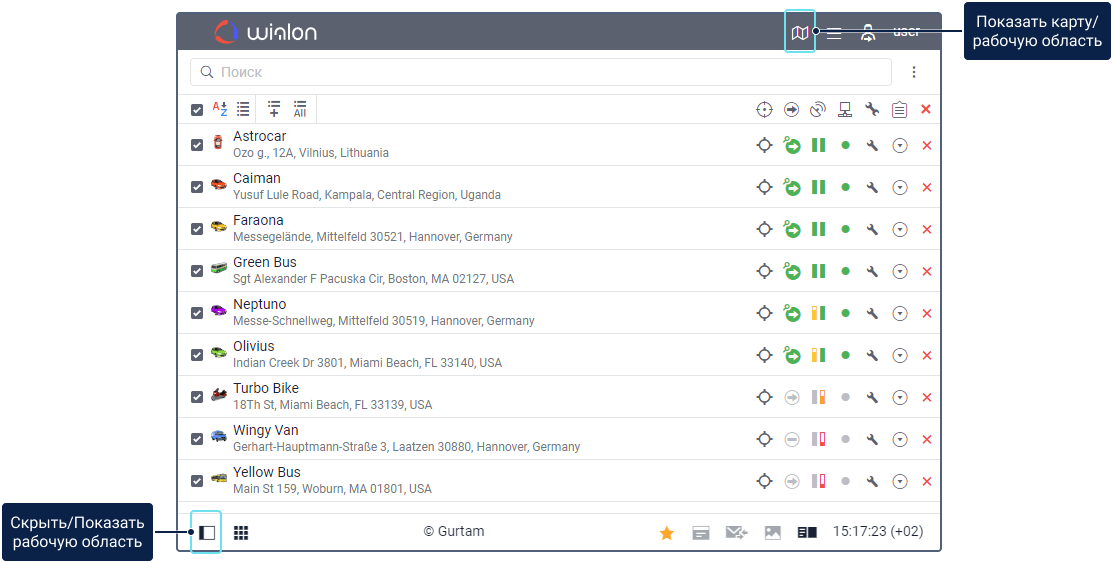 Если ширина экрана не позволяет показывать рабочую область и карту одновременно, то для переключения между ними можно также использовать иконку в верхней панели. Вид иконки зависит от открытой вкладки.