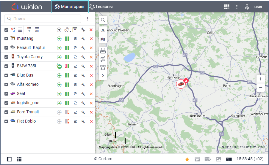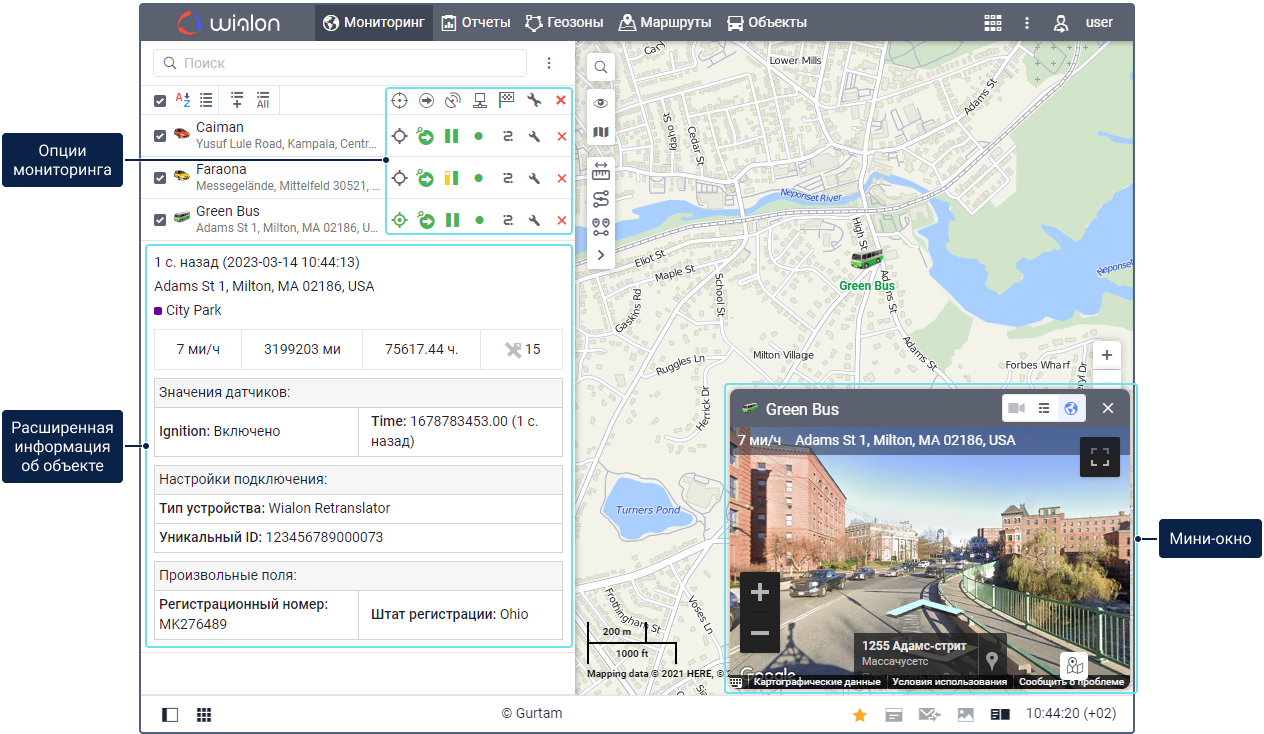 На вкладке Мониторинг показывается рабочий список объектов и карта, на которой можно наблюдать за их передвижением в реальном времени. Здесь доступны основные функции, связанные со слежением за объектами и контролем их параметров.