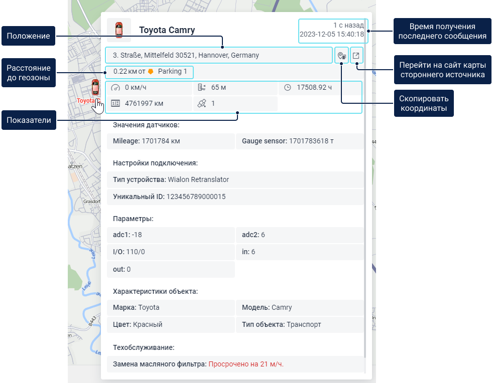 Дополнительная информация может включать в себя следующие пункты: время получения последнего сообщения, местоположение объекта, присутствие в геозонах, расстояние до ближайшей геозоны, скорость, высота, счетчики, спутники, настройки подключения, иконка объекта, значения датчиков, параметры, назначенные водители и прицепы, произвольные поля, интервалы техобслуживания.