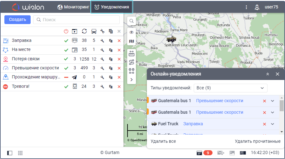 С помощью уведомлений в системе мониторинга можно контролировать перемещение объектов, показания датчиков, назначение водителей, прицепов и пр. В случае срабатывания уведомления возможны: