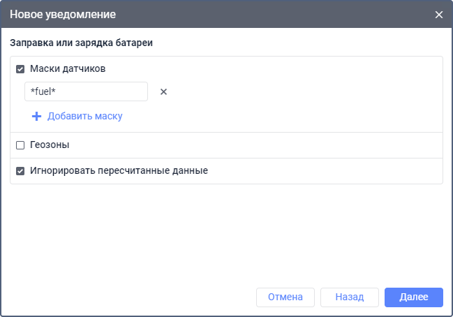 В опции Маски датчиков можно указать одну или несколько масок датчиков, которые должны использоваться для определения заправки или зарядки и ее объема.
