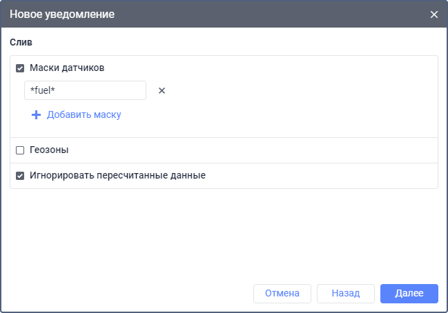 Уведомление срабатывает отдельно по каждому датчику уровня топлива. Опция Рассчитывать данные по датчику в свойствах датчика не влияет на уведомления этого типа, то есть если она отключена, уведомления продолжают срабатывать.