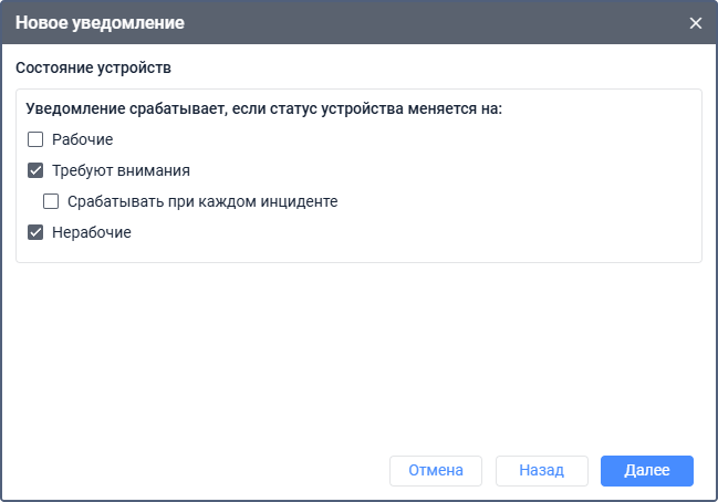 | Требуют внимания | Уведомление срабатывает, когда для устройства объекта регистрируется инцидент, соответствующий одному или нескольким критериям. Включите опцию Срабатывать при каждом инциденте для генерации уведомления каждый раз, когда регистрируется инцидент в рамках статуса Требуют внимания. |