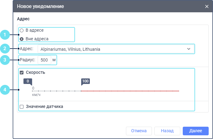 - Чтобы указать разрешенный диапазон значений скорости, включите опцию Скорость и перетащите маркеры нижней и верхней границы диапазона. Красная часть шкалы показывает значения, при которых должно срабатывать уведомление.