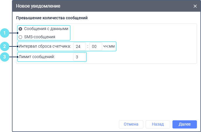 При помощи уведомлений этого типа можно контролировать количество сообщений, полученных от объекта в течение определенного временнóго интервала. Это могут быть обычные сообщения с данными (координатами, значениями датчиков и т. д.) или SMS-сообщения.