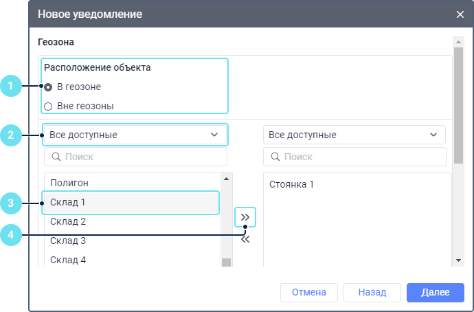 В левом списке выберите геозоны или группы геозон (показываются в квадратных скобках), для которых должно срабатывать уведомление. Для поиска можно воспользоваться динамическим фильтром над списком.