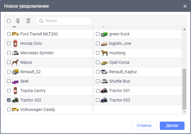 Перенесите в правую часть окна объект или объекты, расстояние до которых учитывается для сработки уведомления. Чтобы найти нужный объект, используйте динамический поиск над списком.