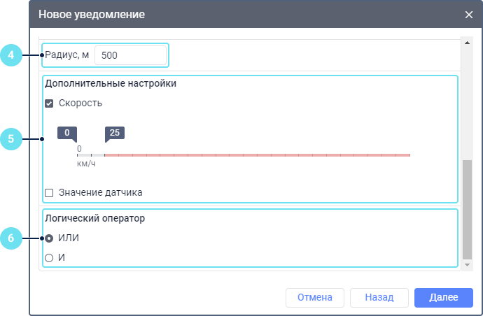 Выберите логический оператор , на основании которого должно срабатывать уведомление, если выбрано несколько геозон. Доступны операторы ИЛИ и И .
