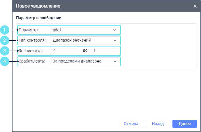 С помощью этого типа уведомлений можно контролировать параметры датчиков в сообщениях . Он позволяет контролировать параметры, присылаемые оборудованием и не предусматривает контроль виртуальных параметров (sats, speed, lat и т. п. ).