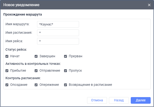 Дополнительно можно указать маску имени маршрута, расписания и/или рейса.