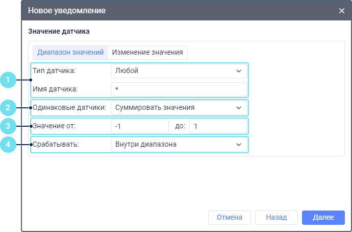 Укажите минимальное и максимальное значения датчика. Для контроля конкретного значения введите одно и то же число в поля Значение от и до, например, от 1 до 1.