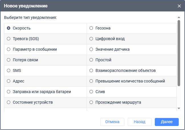 В зависимости от условий срабатывания, уведомления в системе Wialon подразделяются на типы, которые можно выбрать во время создания уведомления.