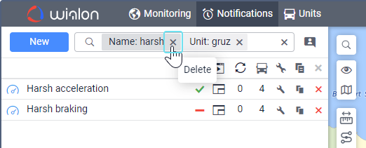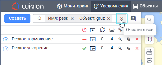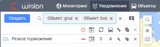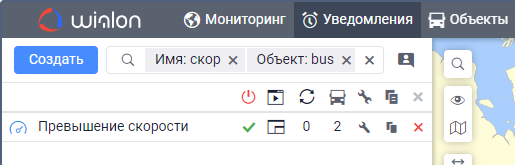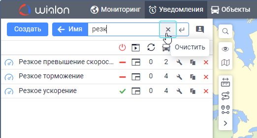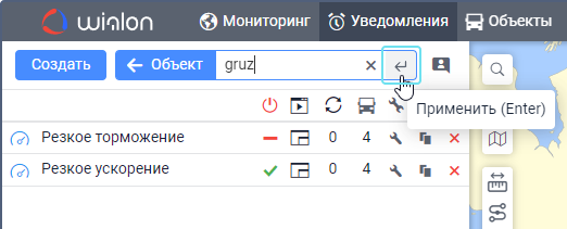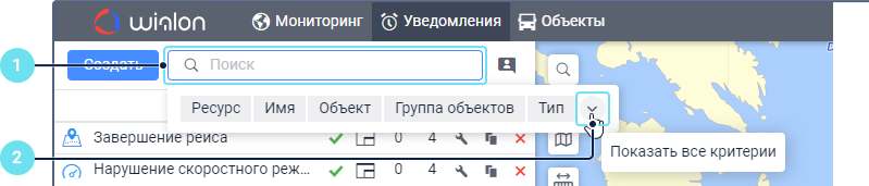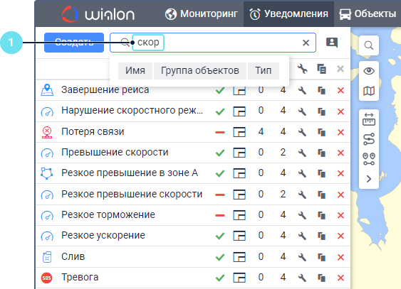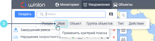 Под полем показываются все критерии поиска, которым соответствует ваш запрос. Например, если вы ввели скор и у вас есть уведомления с именем Превышение скорости, уведомления с типом Скорость и уведомления, созданные для группы объектов Скоростные автомобили, то под вашим запросом покажутся критерии Имя, Тип уведомления, Группа объектов. - Выберите критерий поиска.