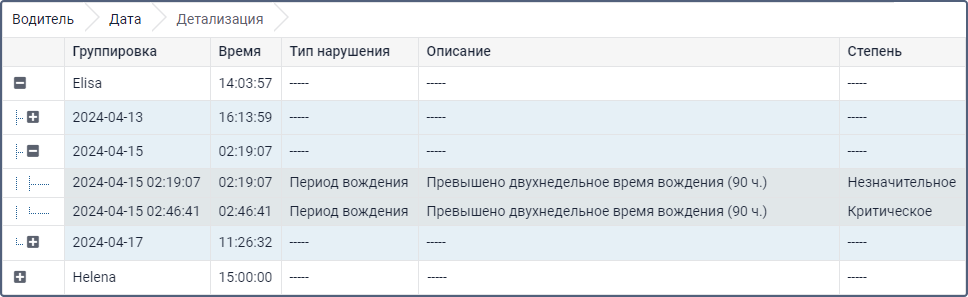 | Время | Дата и время регистрации нарушения. Если водитель ехал на протяжении 6 часов и более, то нарушение регистрируется в тот момент, когда длительность вождения без учета работы составила 6 часов (+/- 1 минута) с начала движения. Такому нарушению соответствует степень Критическое. Если водитель ехал от 5 до 6 часов, то нарушение регистрируется в момент, когда длительность вождения составила 5 часов, а если он ехал от 4,5 до 5 часов, — то когда она составила 4,5 часа. Таким нарушениям присваиваются степени Значительное и Незначительное соответственно. Таким образом, при повторном выполнении отчета за сегодняшний день можно получить разные данные о последнем превышении длительности вождения. Например, если при первом выполнении отчета водитель успел проехать 4 часа 40 минут, а при втором — 5 часов, то время регистрации и степень нарушения в первом и втором отчете будут отличаться. При этом, независимо от степени нарушения, для него выводится описание «Превышено непрерывное время вождения (4 ч. 30 мин.)» |