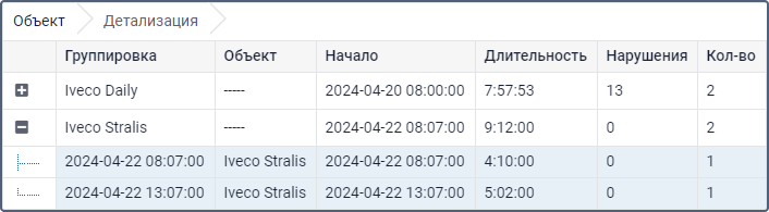 | Кол-во | Количество нарушений. Если включена опция группировки, в этом столбце показывается общее количество нарушений за выбранный интервал. |