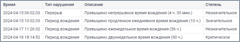 В этом отчете можно получить информацию о нарушении водителем режима труда. Нарушения определяются в соответствии с нормами ЕСТР.
